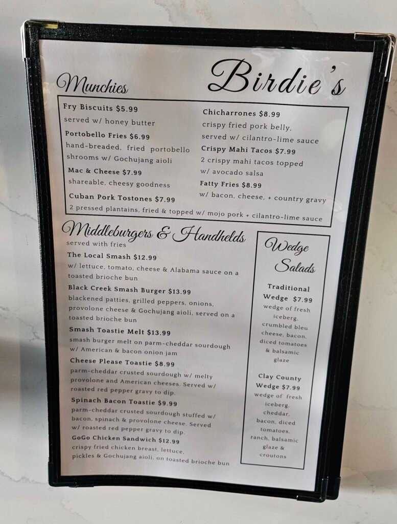 Birdie’s Dinner & Dessert is open Wednesday through Sunday from 4:00 to 10:00 pm. You can find it at 2620 Blanding Blvd #16, Middleburg, FL 32068.