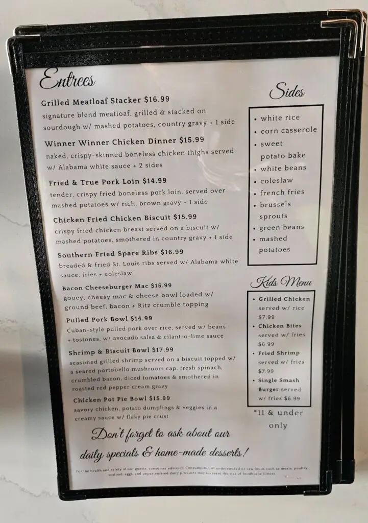 The menu blends familiar Southern-style classics with fresh twists. Signature items include a grilled meatloaf steak paired with creamy mashed potatoes, a shrimp and biscuit bowl full of rich, savory flavor, and the Black Creek Smash Burger that locals are already talking about. Choose from homestyle sides like corn casserole or Brussels sprouts to complete your meal.